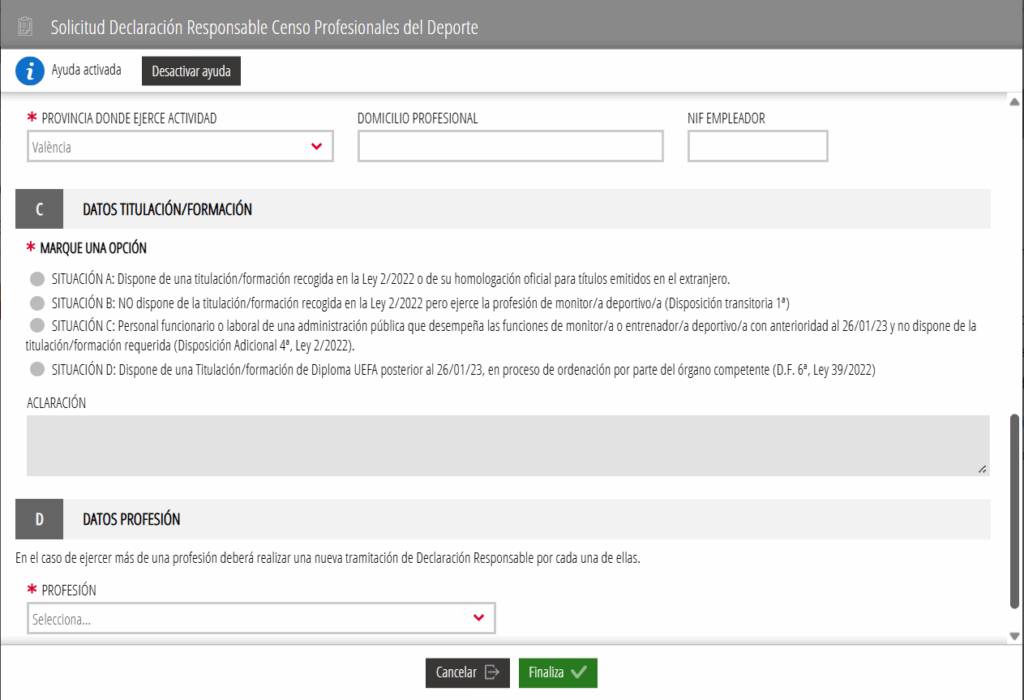 Por último debe rellenarse los datos de la profesión que se está ejerciendo: