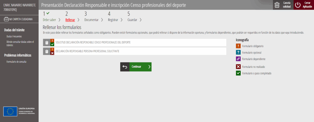 Adjuntamos nuestros títulos, certificados, o declaración responsable, etc y pulsamos en continuar: