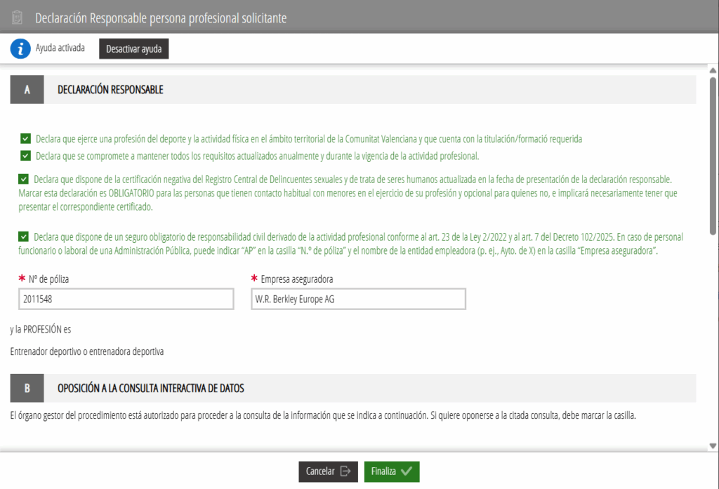 Debemos cliquear en todos los check de la declaración responsable para convertirlos en verde, añadir el número de póliza y la compañía, que en el caso de los colegiados es: 2011548 y W.R. Berkley Europe AG