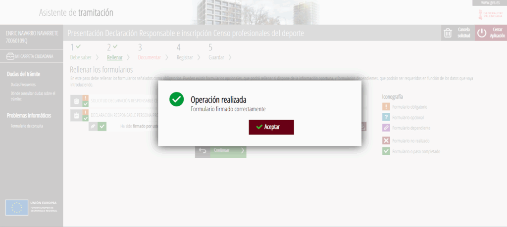 Una vez pulsado el botón finalizar, se accede al formulario con la «DECLARACIÓN RESPONSABLE»