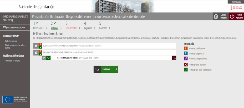 Tras finalizar, hay que firmar el documento con firma electrónica y al acabar la X roja se habrá vuelto un check verde y habrá que pulsaren continuar: