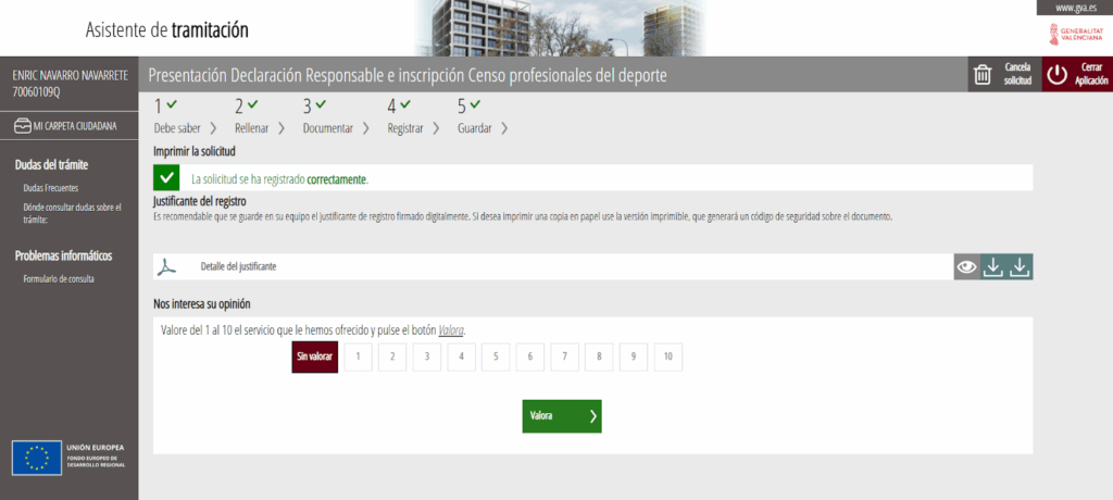 Y pasaremos a la opción de «Guardar y Descargar» la inscripción en el Censo de profesionales del deporte, pudiendo rellenar una encuesta de valoración.