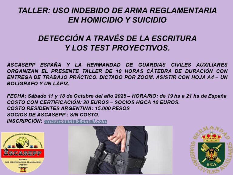 Inicio / Evento / TALLER – USO INDEBIDO DE ARMA REGLAMENTARIA EN HOMICIDIO Y SUICIDIO DETECCIÓN A TRAVÉS DE LA ESCRITURA Y LOS TEST PROYECTIVOS