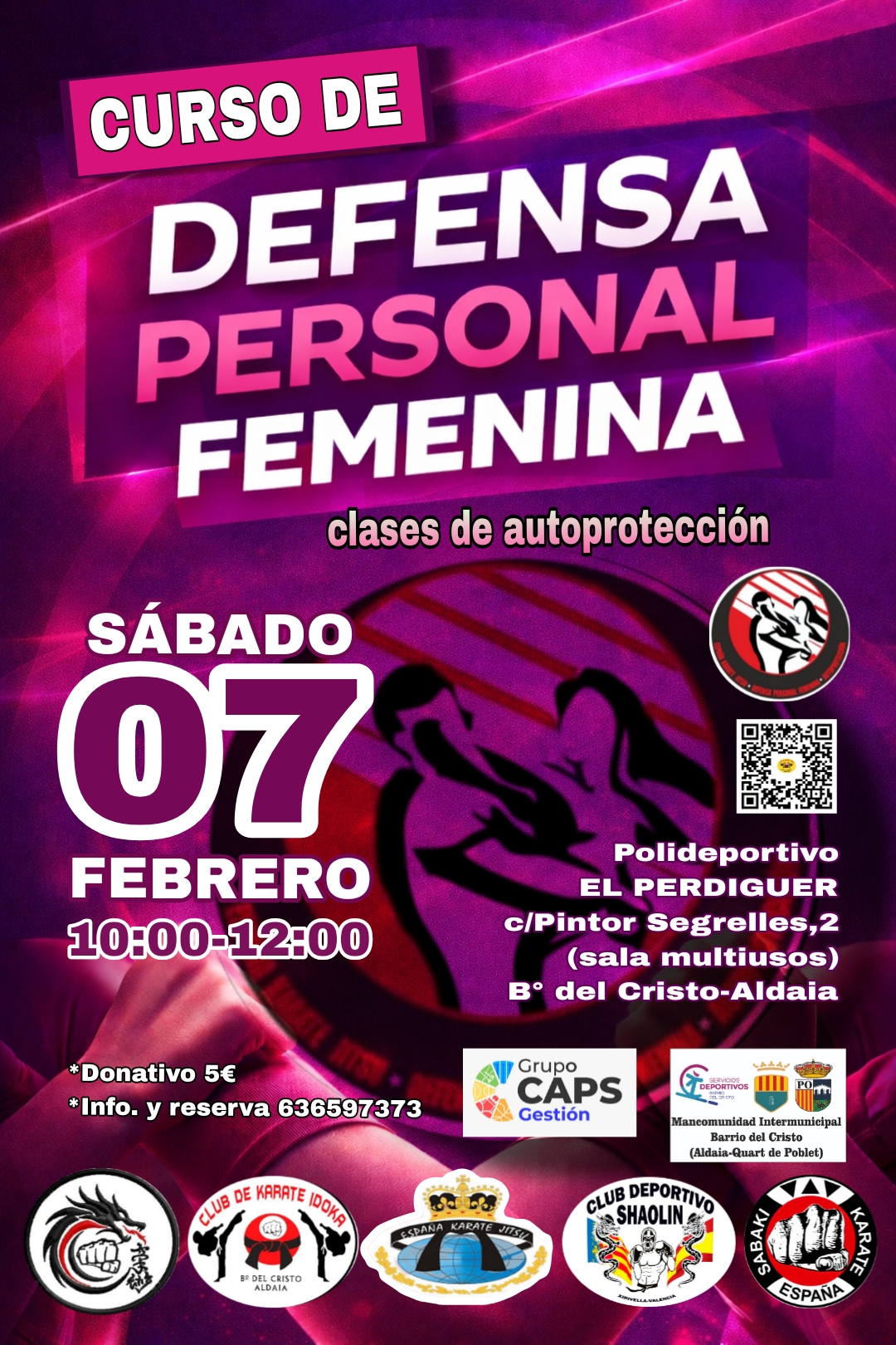 Curso defensa personal femenina febrero 7 POLIDEPORTIVO EL PERDIGUER Carrer Pintor Segrelles, 2, Barrio del Cristo, ALDAIA, Valencia 5€